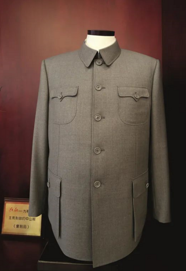 在孙中山先生的授意下,把中山装融入深刻的文化内涵,改成直翻领,依据国之四维(礼、义、廉、耻)而确定上衣前身设4个口袋,上面两个袋盖做成倒山字形笔架式,称为“笔架盖”,象征中国民主革命要重用知识分子;依据当时区别于西方国家三权分立的五权分立(行政、立法、司法、考试、监察)而确定前门襟正中5粒明纽扣,象征五权宪法;又依据三民主义(民族、民权、民生)而确定袖口,袖口3粒扣即象征三民主义;后背不破缝,象征祖国统一;中山装的诞生,是中国服装发展史上的一场震撼性的革命。之后,几经改革,中山装成为中国人民重要的礼仪服装,所以中山装又称“人民装”,被誉为中国人的“国服”,陈毅元帅曾说:“中山装是中国人的骄傲。”