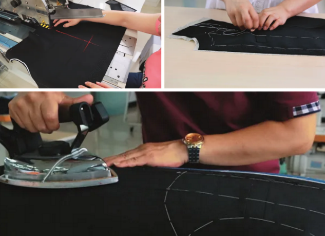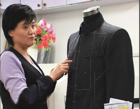 红都中山装的工艺特色和神韵在一些细节上体现最为显著。比如口袋,“根据身长配口袋,根据胸围配大小,根据口袋配兜盖”,是中山装制作的准则。还有一些不成文的细节,如胸部平贴袋有两道缝合线,一明一暗,使其更为服帖;底部口袋是老虎袋,即口袋边缘悬出1 ~ 2 厘米;门襟共5 粒扣子,第二粒扣子和胸袋的兜盖持平,最后一粒扣子和底袋的兜盖持平。领子和腹部的处理也是红都中山装的特点:领子既要挺拔又要松紧适度,根据脖围的大小可采用单独裁领或一体剪裁。 中山装穿在身上,4个兜平整服帖,还可以装一些小物件,复杂的做法很是令人不解。对此, 蔡师傅介绍道,“中山装的每一个口袋也都有讲究,衣服口袋是掏着缝的,就是从口袋里面缝上。”还有兜盖要有圆弧,两边的兜盖要一致,不能有角。这些制作细节,都是靠技师多年的经验和手艺摸索出来的。
